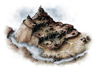 Slavhandlarnas by Korpehåla / Ravenhole, ritad av Niklas BrandtYtterligare en förutsättning var att spelarna inte ska behöva plugga in världen på förhand utan kunna grabba en äventyrsplats och sätta igång utan stora förberedelser. Lösningen blev här att världen (egentligen ett landområde stort som mellansverige, där eventuella expansioner kommer att kartlägga grannländer) legat under en mystisk blodsdimma under de senaste tvåhundra åren. Möjligheten att resa har varit mycket begränsad, men nu har dimman oförklarligt (?) lyfts.