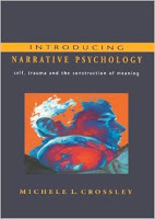 Jag läser för närvarande den avbildade, mycket givande boken av Michele Crossley. Min dotter Maja studerar psykologi i Göteborg och jag snappar upp en del inspiration när jag får se uppsatser och annat hon arbetar med. Bland annat skrev jag till ett par av hennes gästföreläsare och fick en hel del tips från dem. Psykologi är, inte helt oväntat, ett ämne som berör alla och kanske har särskilt mycket att ge oss författare*. Just Crossleys bok har jag funnit föredömligt klar och kortfattad, med många tips om fördjupad läsning.Narrativ psykologi handlar om hur vi bygger våra jag och vår förståelse av omvärlden som berättelser. Jag har själv länge sett sökandet efter mönster som en av människans främsta särarter. Det är ju heller ingen slump att gudarna kallas ”berättare” i konfluxsviten eller att mina böcker i serien i mycket handlar om bokfigurernas förhållande till vävens framvältrande historia.