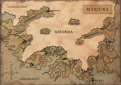 När jag slutligen passade in Marjura mellan Palamux och Trinsmyra i romanen, så vred och töjde jag på ön för att få till en intressant inpassning, exempelvis så att avflödena i jökellandet bildar en insjö utanför Fontra Cilor som så småningom får Kafassafloden att vända och Fokalerslätten att översvämmas och åter bli fruktbar.