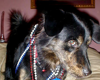I hate to say it, but most people have a kind of wrong-headed idea of what Mardi Gras in New Orleans is like--mostly because the images that play best on TV are drunken crowds in the French Quarter, baring it all for beads. Here's my boy Tanker, baring it all for beads. And you can tell how happy he is about it. You probably can't appreciate it from the photo, but he weighs 90 pounds and is prancing on the sofa.