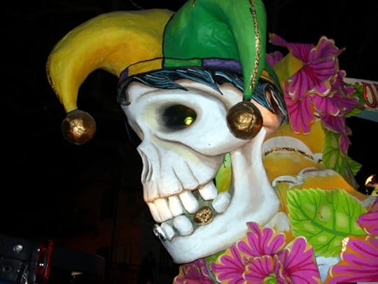 First, a gratuitous photo from the Royal Street photo album. I haven't tackled a Mardi Gras story for the series yet, but it's coming eventually, I hope. And since it's almost Mardi Gras time, I'll salute one of my favorite krewes, Krewe D'Etat. Their floats are always political and scathingly sarcastic, not to mention very clever. But this is one of my favorite shots of their general standing floats that rides along every year--their symbol, or mascot if you will, is a skeleton. So, viva Le ...
