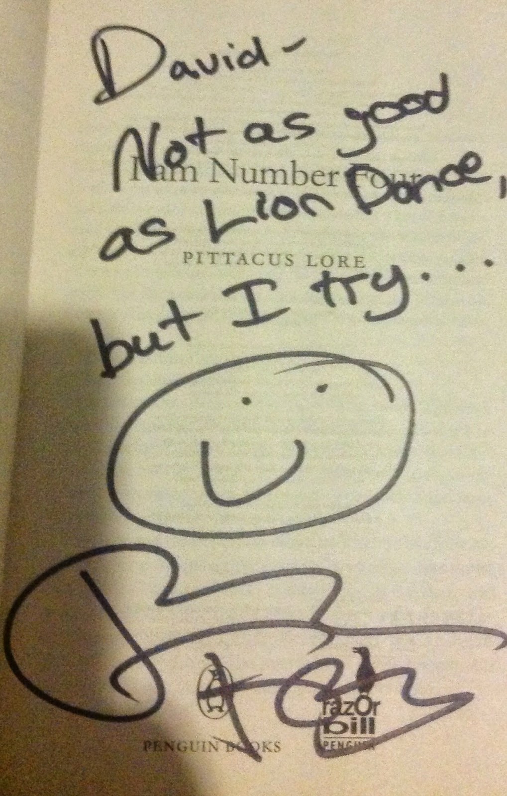 As Chinese New Year is approaching, I brought along my book The Lion Dance for him as a souvenir and I inscribed it to his young daughter, Margot. And in return he signed my copies of Endgame and I am Number Four. Thanks, Mr Frey!