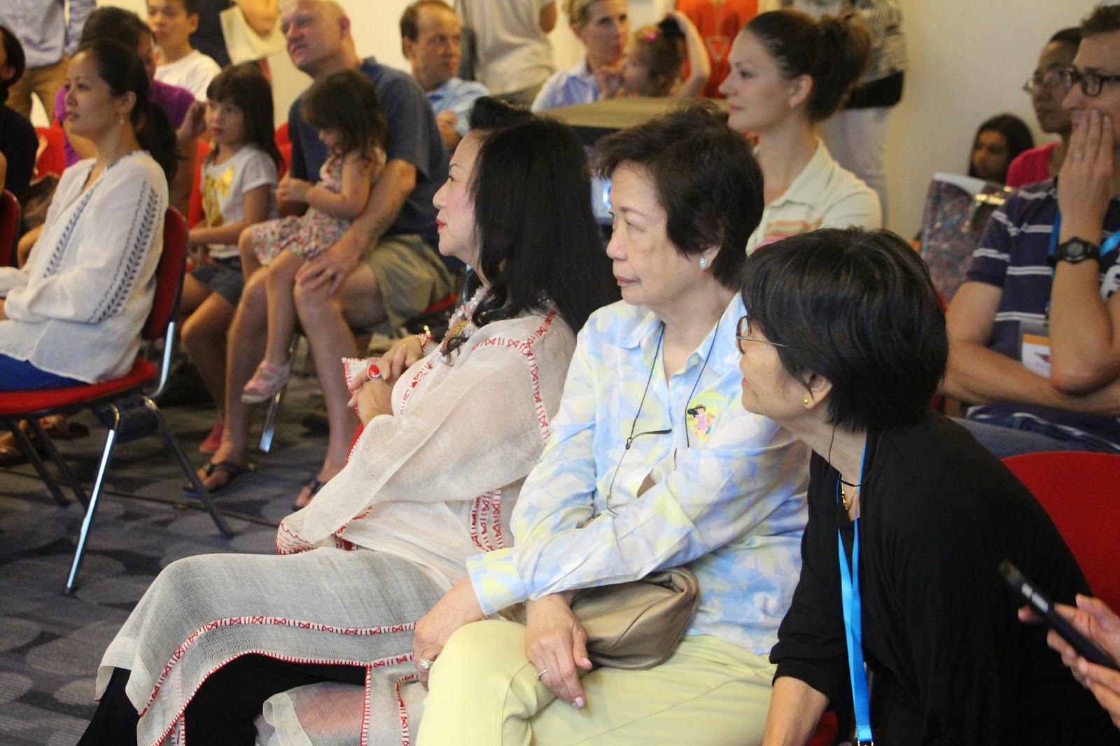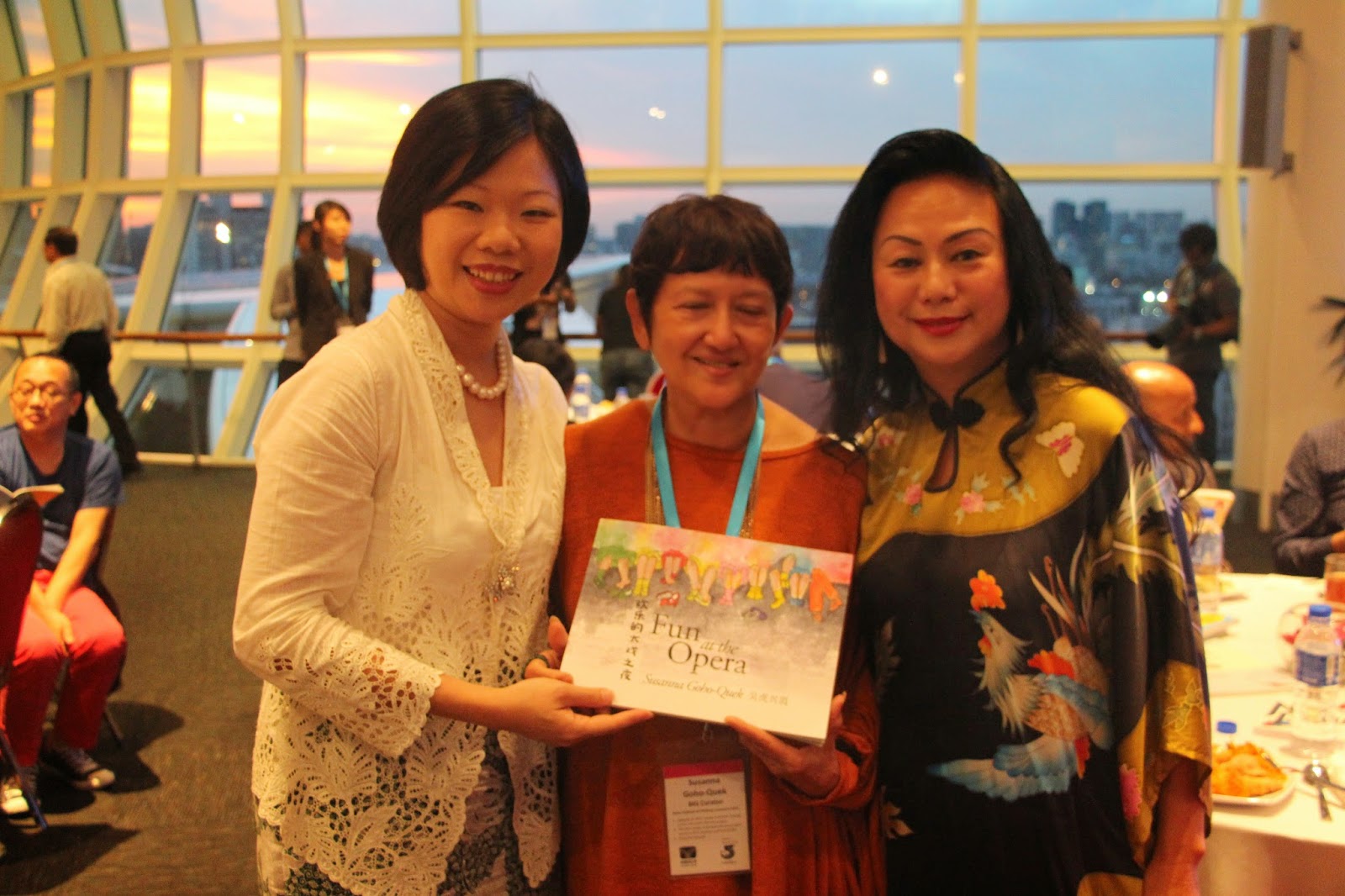 When Guest of Honour Ms Sim Ann spoke of the importance of local books and she thanked the authors who had given her books for her children, who are huge fans of local books. Hey, wait, I wasn't one of those authors! I have to give her some of my books STAT! Unfortunately I didn't have my books with me, but Auntie Susanna managed to show her new book "Fun at the Opera" to her.