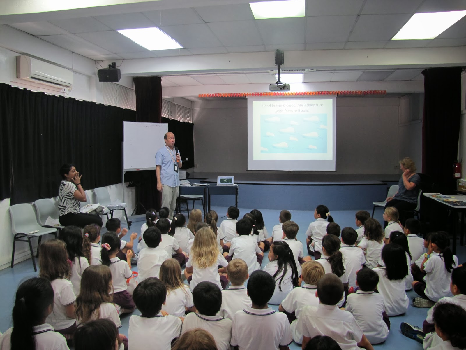 Denise and SarahNow in my defence, I only go off topic when people, and when I say people, I mean Denise and other grown-ups, start talking about topics I don't want to listen to. Nevertheless, when it was time to go up to the multi-purpose hall where my talks were to talk place, I repeated this mantra: "Don't go off topic, don't go off topic, don't go off topic."We plugged the projector into my computer and then the kids streamed in class by class. I handed my camera to Denise and asked her to take photos.