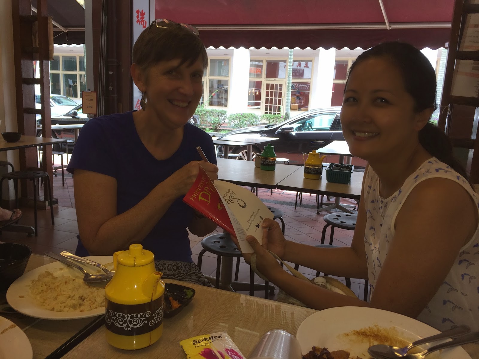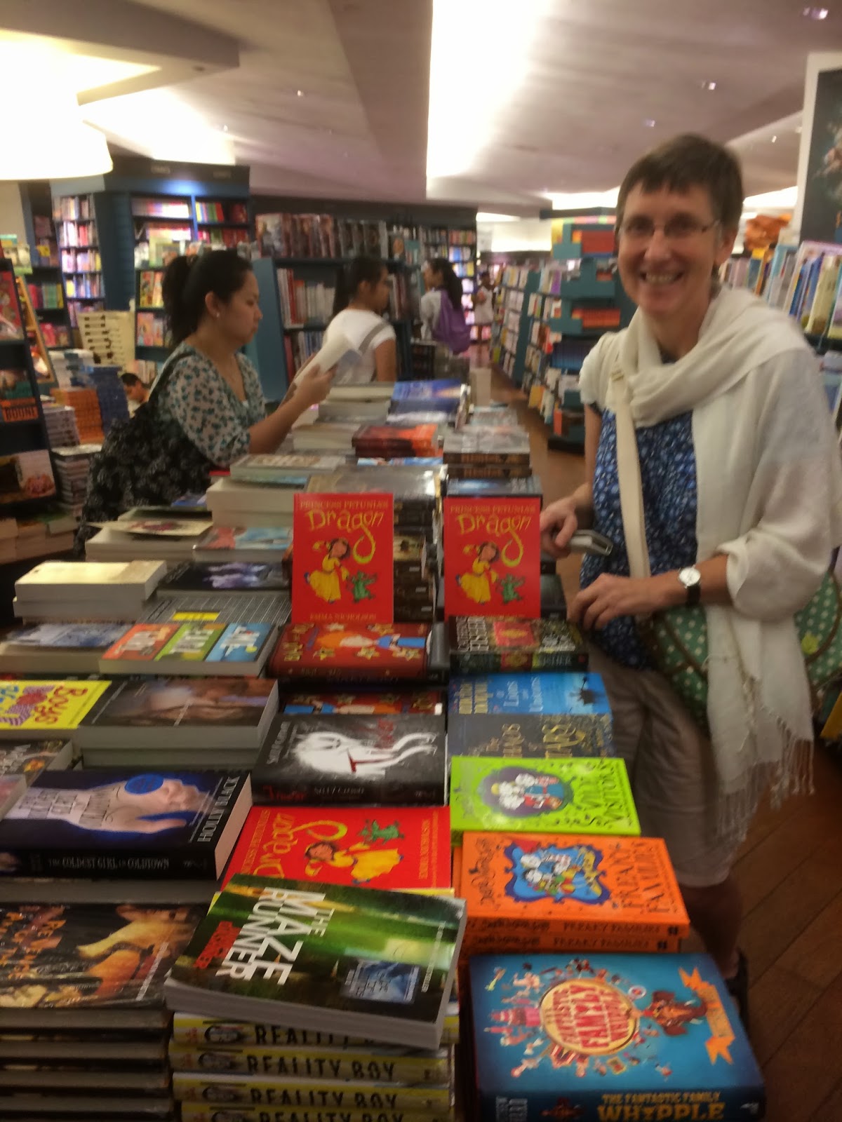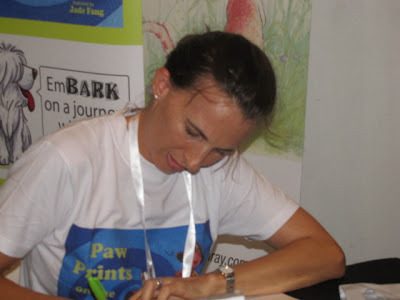 Emma at Kinokuniya with Princess Petunia!Sarah's back safely from Cambodia and is hard at work on the third book in her pawtastical Purple Paw Print series and it should be out by May, just in time for the Asian Festival of Children's Content, right, Sarah? Sarah's award-winning books are so much fun and unpredictable too. Kid's love them and I can't wait for the next one too!