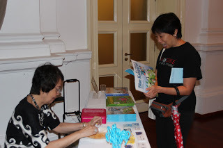 I recently had the pleasure of participating in the Let's Read Together event organized by the National Book Development Council of Singapore, Asian Festival of Children's Content and sponsored by the Public Libraries and QBE and Pelikan. I think the kids had a great time, though some seem a wee bit too preoccupied by my lack of hair "You're bald" a few kids pointed out. I responded by saying that they would be too in the future:).Susanna Goho-Quek held two book making classes with the kids and after that they dramatized my book There's Soup on My Fly! By the end of the day I was exhausted but it was a day well spent.