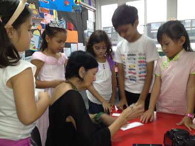 Geronimo Stilton was racing down the corridor with Harry Potter, while Cinderella and Tintin darted down the stairs to the school canteen at the Overseas Family School. It was like the characters from every story ever written had leapt off their pages and descended upon the halls of the international school. But in reality, it was Story Week at the OFS and that's why Melissa McGoldrick invited both Susanna Goho-Quek for a school visit to talk to the kids about writing and illustrating children's picture books.I have to say that I felt rather under dressed for the occassion, if I had known there was a fancy dress dress code I would have come as Charlie from Charlie and the Chocolate Factory or Voldermort from Harry Potter instead of my plain old boring self.
