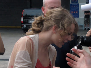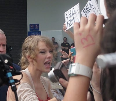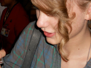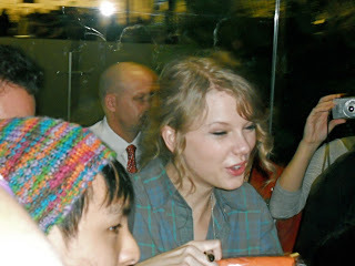 Crickey I thought, these are young kids and they can't even recognize their idol? Then an ear splitting shreik rang from the crowd, the kind of shriek that would have dogs from here to Ethiopia howling in pain. Taylor was spotted. Pony tail, Plaid shirt, freshed faced and cheerful. She took a pic of the fans and they shreiked more.