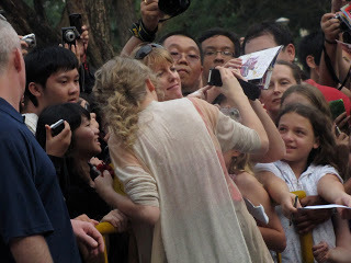 Taylor and fan (photo courtesy of ManfredKueh)Then he handed me some Speak Now wrist bands to pass on to my niece, nephews as well as a couple of guitar picks. I couldn't believe it. I thanked him. I was a bit taken a back when he said at first he thought I was an autograph dealer on ebay. I have to say I detest autograph dealers, like seriously detest them cos they make things harder for real fans, and I was also amused cos I don't even have an ebay account!
