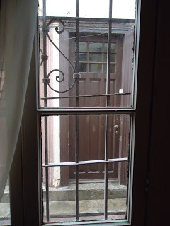 I have one of the views I’ve always dreamed of. I can’t really describe it to you, because I have a really hard time describing buildings (you may recall I asked you to take care of the house descriptions in The Good Boy). But look! Pretty iron gatey thing over the window and a view of number 11’s door. It’s not sweepingly scenic, but it feels perfect for some reason.