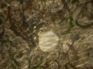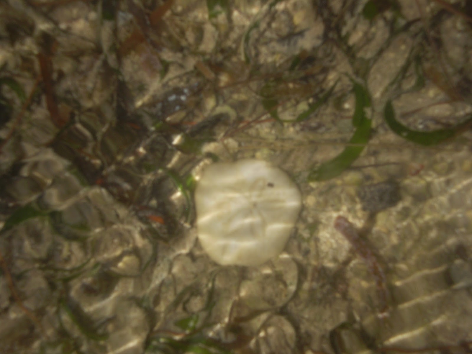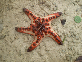 Remember how Lee finds a green sand dollar? Here's one, next to an orange star fish: