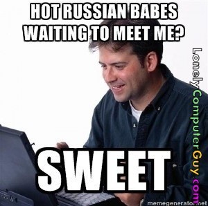 However, I would like to thank you for accidentally steering me toward a new plot bunny. No, it's not the one where an ignorant fool sends a stranger her bank account details, it's the one with the Russian brides. Except in my universe it would be a Russian groom. Because, you know, I'm an equal opportunist (emphasis on "opportunist") and I wonder, given that same sex marriage is legal is some places now, if you guys aren't overlooking the gay demographic? I suppose what I'm really asking is do you have a brother?
