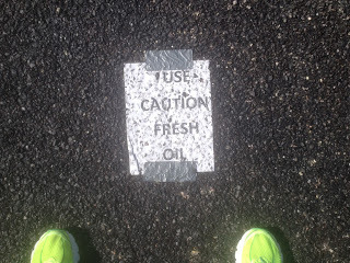 In the past, there have been no signs or warnings of the fresh oil, so when I saw the signs this year (regular copy paper duct-taped to the road), I was impressed. Let's be honest here - I laughed so hard I could hardly see ...