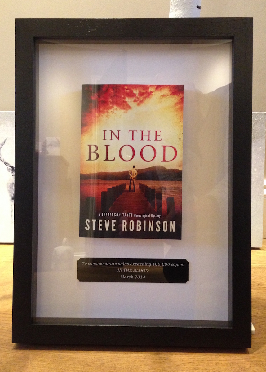 A Christmas present from my publisherI received a very nice Christmas present from my publisher, Thomas & Mercer, recently: a commemorative framed copy of my first book in the Jefferson Tayte Genealogical Mystery series, IN THE BLOOD, for exceeding sales of 100,000 copies with them since they took over publication in March 2014. It's taken pride of place on the wall in my writing cabin.