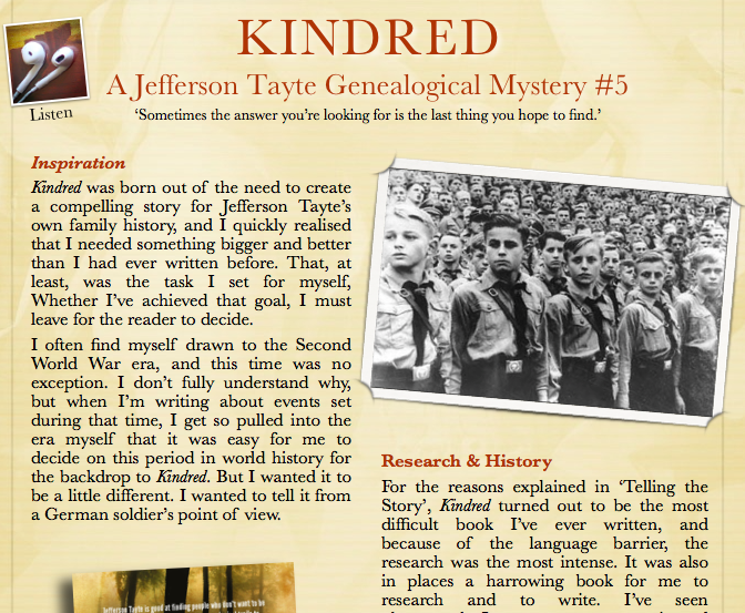 Ahead of the launch of my 5th book in the highly rated Jefferson Tayte Genealogical Mystery series, Kindred, which is out 12 April, Amazon have reduced the price of my books on Kindle in the UK to just 99p during March, and in the Amazon store Australia to $1.49 as part of their Kindle Monthly Deal.If you're looking for a new angle on crime fiction, and particularly if you enjoy cold case mysteries, why not take a look at the reviews and maybe try one out while they're on offer?