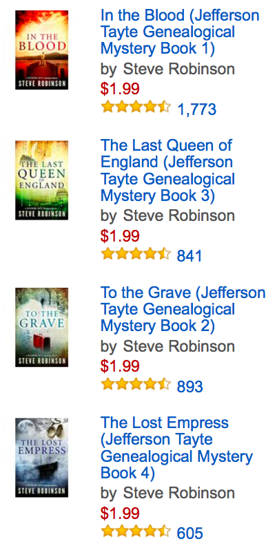 If you do your grocery shopping in Euros, during February you can pick up all of the books in my highly rated Jefferson Tayte Genealogical Mystery series (English language editions) for just €0.99 each for Kindle. Follow this LINK to visit my author page at the Amazon store in your country for offers.