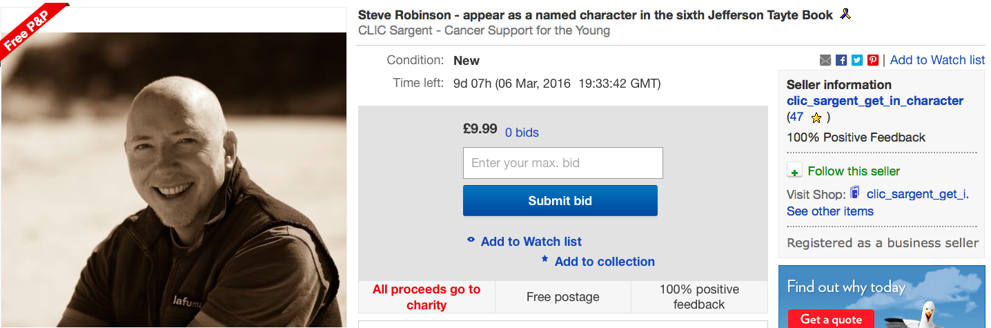 It's an honour to be able to help out with a donation of a character name for my new book.There is also the chance to get your hands on signed books from Lee Child, Ian Rankin, Tania Carver, Peter James, Liane Moriarty and Kathy Reichs, and aspiring writers can bid to have their work critiqued by best-selling authors Eve Seymour, Claire Dyer and Philippa Ashley.Last year, the Get in Character auction raised £14,500 to help CLIC Sargent provide clinical, practical and emotional support to children, young people with cancer and their families.The bidding starts at 8pm Thursday, 25 February and ends at 8pm Sunday, 6 March 2016.Find out morePlease contact our team by emailing: charityauction@clicsargent.org.uk.