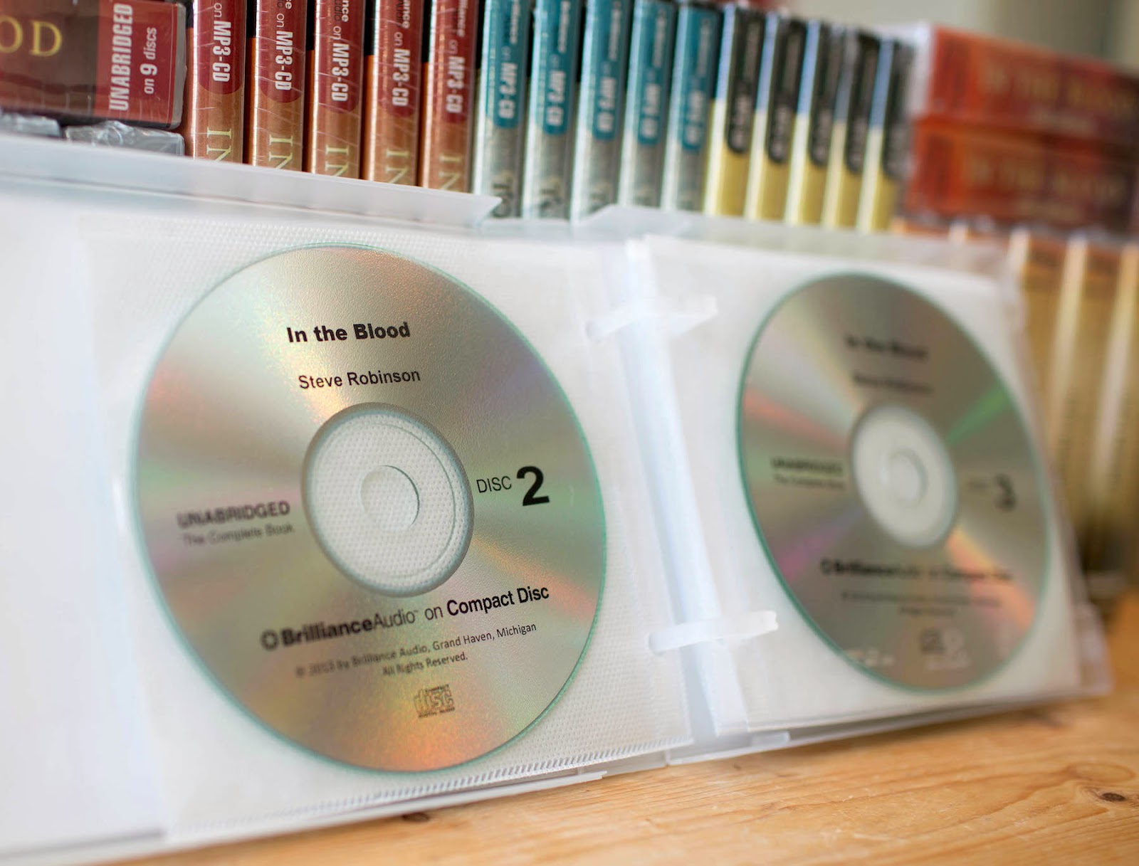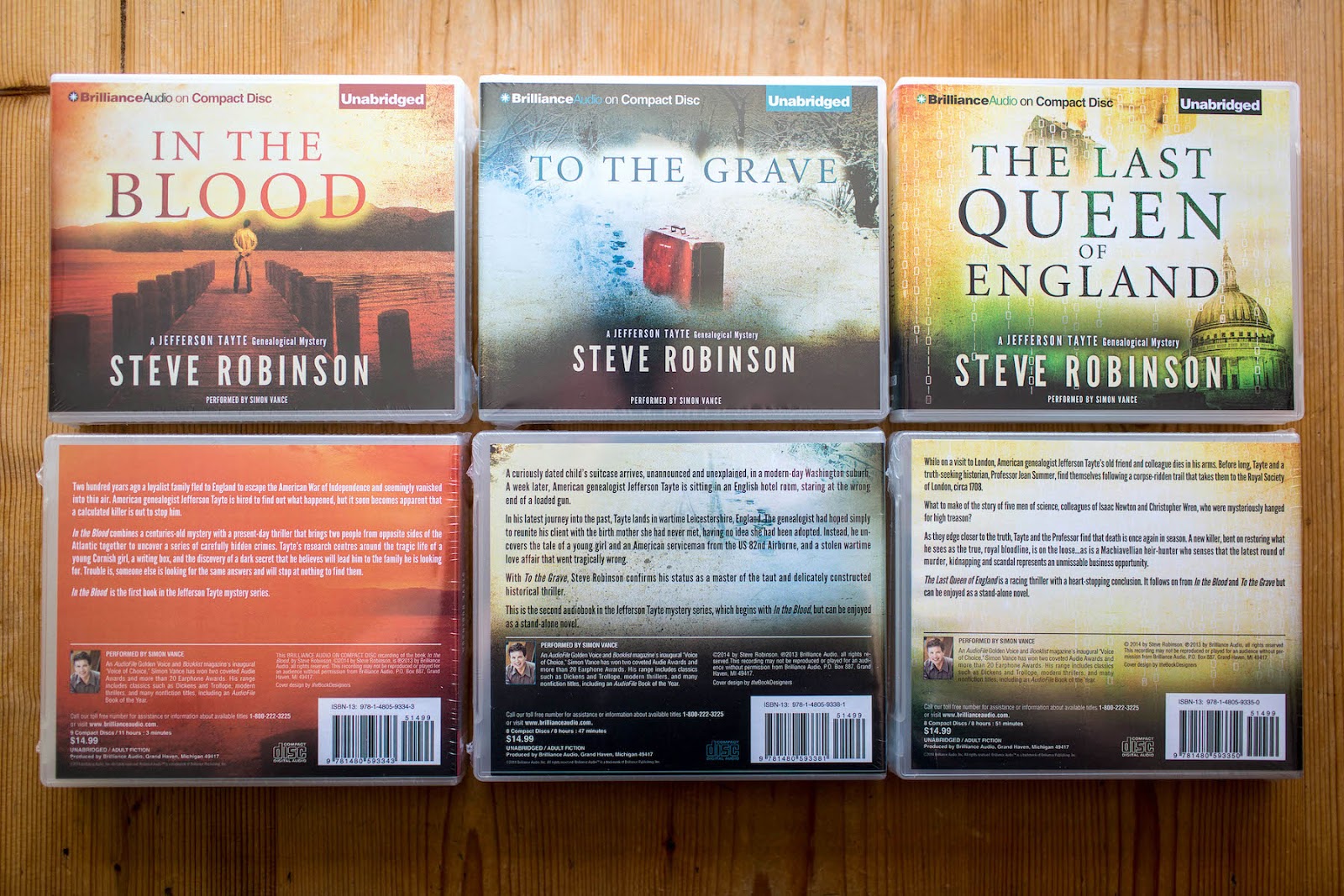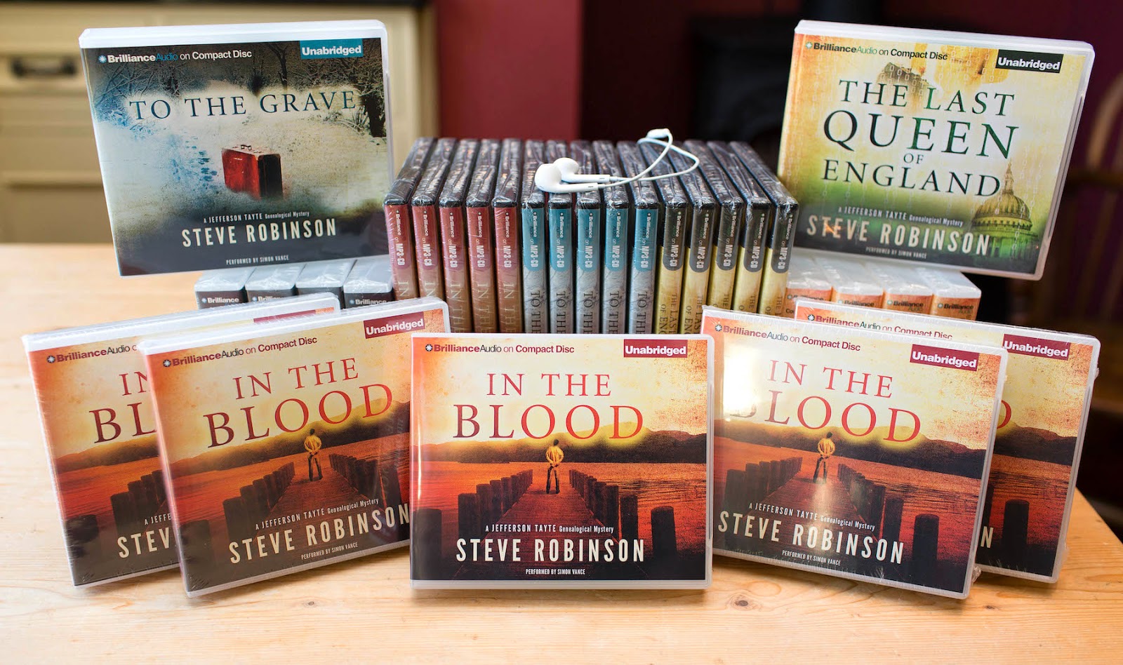 This week saw the arrival of some advance copies of my books, as performed by multi-award winning narrator, Simon Vance, in CD and MP3 audio formats from Brilliance Audio. It was a particularly nice surprise as I wasn't sure whether I was going to receive any audiobooks until the van pulled up outside my house to deliver them. They're in their full retail packaging with a price tag of $14.99 printed on the back, which seems very reasonable for a nine CD set in the case of In the Blood. Amazon UK will be retailing them at £10.80 and just £6.82 for the MP3 download.