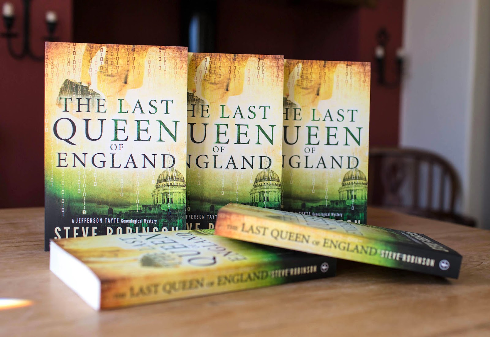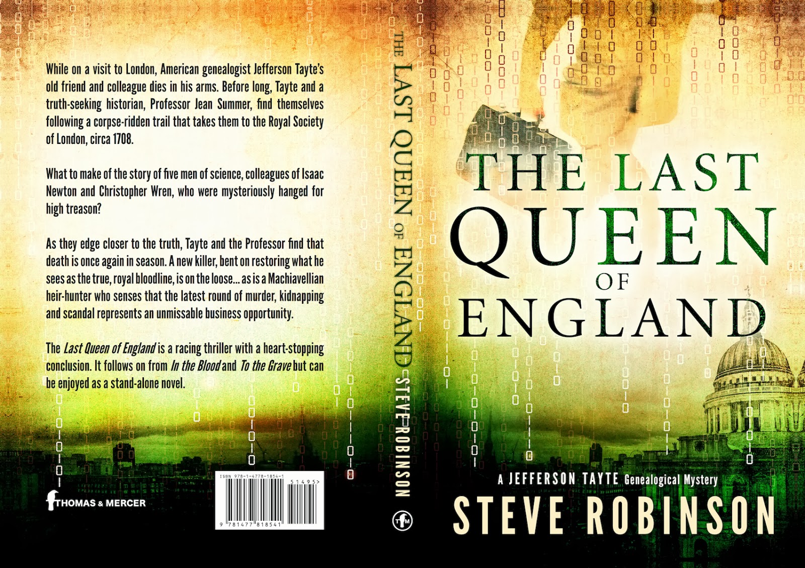 As promised last week, here are some photographs of the new paperback edition of my third book, The Last Queen of England, which is out next month on March 18. For me, this cover marks the greatest change from my original cover image, and much for the better I think. It's closer to how I originally imagined the cover, but I was unable to reproduce it with the tools at hand. I love the movement provided by JT in the top half of the image. It says he's going to be doing some running around in this book and he certainly does plenty of that. I also wanted to get those binary digits in, and I think Amazon Publishing did a great job with them. It says there's a puzzle at the heart of this story, which the original cover also failed to get across. I like the image I made for the original cover, of the statue of Queen Anne with St Paul's Cathedral in the background, but it never really shouted thriller to me, which I feel this new cover definitely does. It gives you a glimpse of what to expect before you start reading, which of course is what a book cover should do.