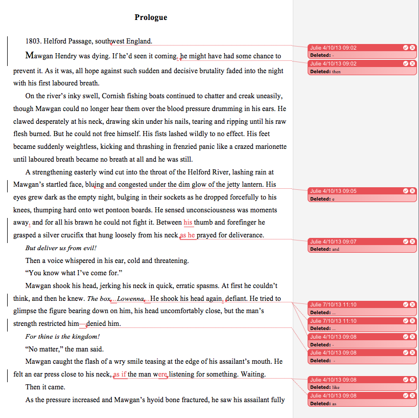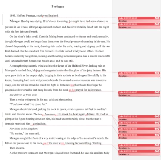 Equally exciting is that I've just (last Friday evening) received the edits back for In the Blood. Yipes, what a lot of red ink! I was hoping this part of the process wouldn't distract me too much from getting on and writing the next book, but it's clear that it will. I was working on it all day yesterday (Saturday) and I'm still only on page 25! But it's all for the betterment of the book, and I have to shout out a little wow! to my copy editor, who has done a great job with it. I thought it was in pretty good shape, but it's about to get a whole lot better.