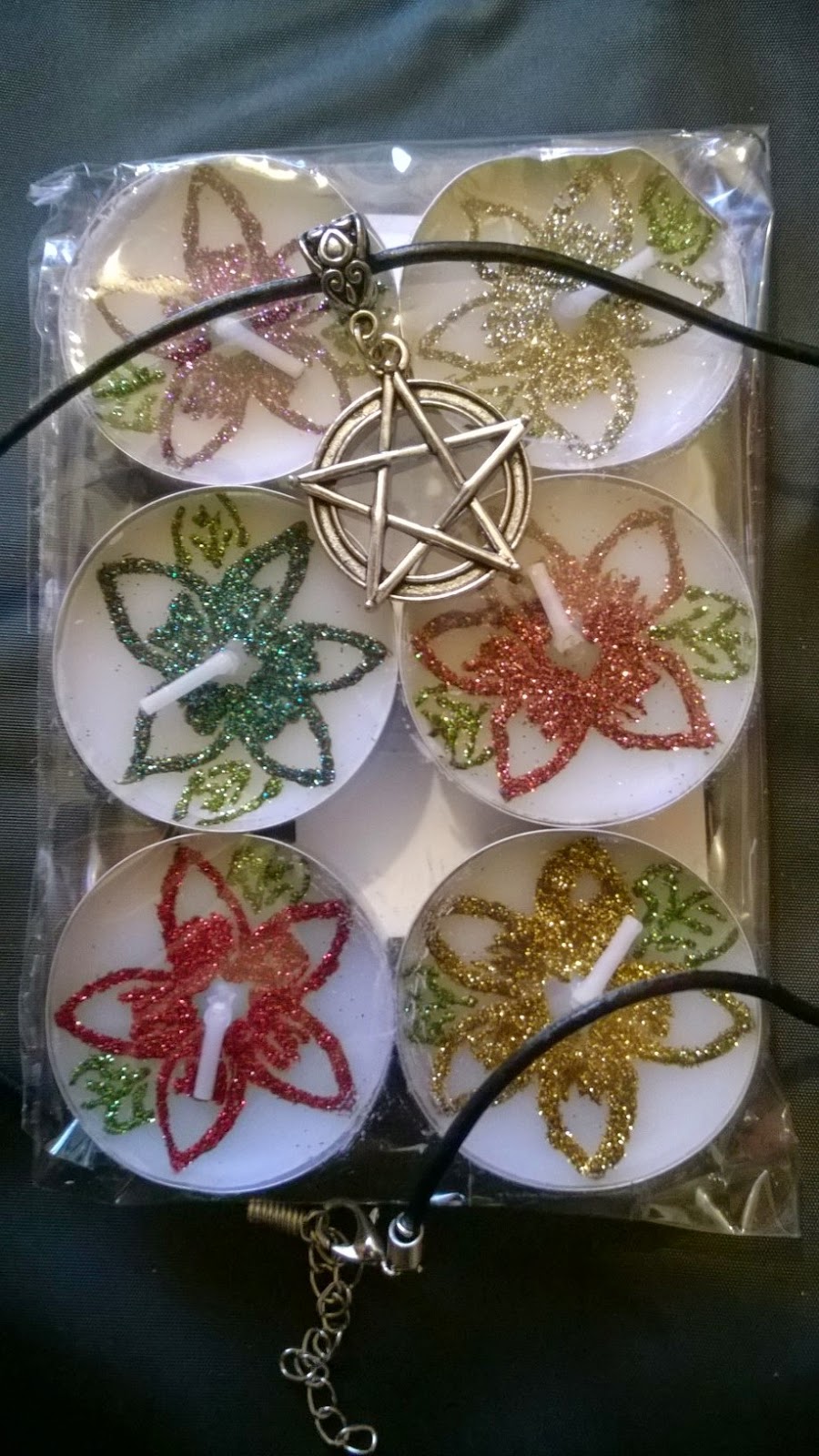 A Pentagram necklace and six jasmine-scented glitter tea-lights, to tie in with the story. Shiny,...