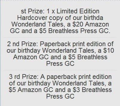 To celebrate their 5th birthday, not only are Breathless Press holding a month long party with a 50% discount on their site, but they're releasing a special collection of Alice in Wonderland themed stories to entertain you. Check back at BreathlessPress.com throughout the month! And to add to the excitement, there's a rafflecopter giveaway HERE. This is what you could win!