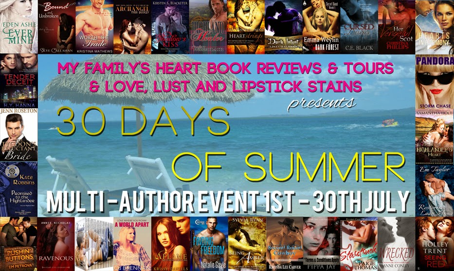 I’m excited to be part of the Love, Lust and Lipstick Stains and My Family's Heart Book Reviews 30 Days of Summer Blog Tour. We have 30 authors sharing excerpts and teasers throughout July all over the internet with the help of some wonderful bloggers! Be sure to stop by our event because there will be some flash giveaways going on plus you'll be able to follow the tour there.