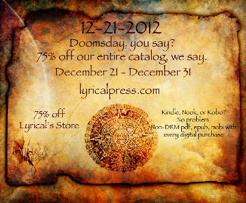 While you wait for the world to end, Lyrical Press Inc. are having a sale. So if you're still around from the 21st to the 31st December, all their titles are an apocalyptic 75% off! That means you can pick up my science fiction romance novel Keir in ANY digital format for just $1.25 here. And while you're there, the rest of the catalogue is also going with a boom. :-P