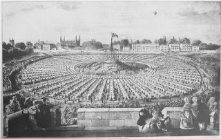 Therealcambridge blog brings out that the good and gracious of Cambridge decided to have a dinner for the poor at Parker’s Piece on Thursday 28th June 1838. 12,000 respectable and deserving "suitable" adults and 2,700 Sunday School children were invited, but of course, not workhouse residents, though workhouse children were given meat that day. Seventy tables accommodated the diners. Upper class residents were invited to purchase tickets to watch the event. Were were these "betters" to sit?