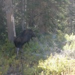 By the time we came back down the trail several hours later, there were many hikers and one bull moose. He did not seem overly bothered by the now-hiking-hordes, but moved slowly, heavily, always staying in the shade. (See shaky point and shoot video of moose at Brighton Ski Resort.)