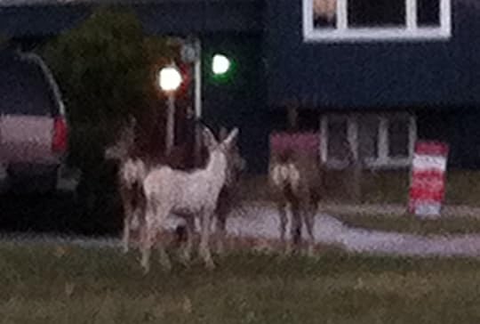 Fun family walk last Thursday: We were on our way to the library and to enjoy the town’s Christmas lights when we saw a young, white mule deer in the neighborhood. It was dusk, so the light wasn’t that good and our son-in-law took a picture with the only camera we had with us–his phone. (Mike, Thanks for the photo.) It’s not perfect, but you can easily make out the deer.