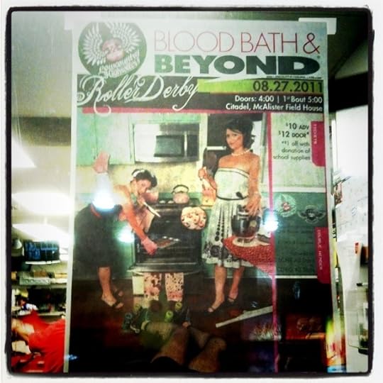 This poster was hanging in various places around Charleston (from which we just returned). I think it's quite clever and nicely done. (Check out that blood spatter on the kitchen towels!) I almost regret I'm going to miss the roller derby action. Almost. School starts tomorrow. GFB is starting junior high–yikes! I'm crossing my fingers for a good day. I will be having fish tacos by myself, accompanied by a book.