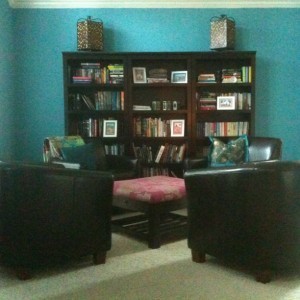 After nine years living in our house, we converted the never-used formal living room to a library. We painted the walls teal, bought some bookcases and some leather club chairs, and added a couple of sassy touches. Voila…we now have a library. It needs some wall art…and maybe a plant, but I LOVE it! It's cozy and sensible and calming and just perfect.