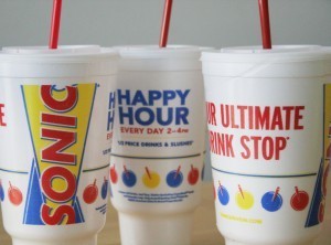 I don't know if you have Sonic where you live, but here, it's something of an OBSESSION. And, oh yes, those caps are warranted. Sonic, for the uninitiated, is basically an old fashioned drive-up…the sort you might see in old episodes of Happy Days. They sell burgers, fries, hot dogs, tater tots, etc. Their main appeal, even in my uncorrupted mind, is their drinks. They serve them in insulating styrofoam, with bunny-pellet ice, and the flavor options are insane. Cherry Vanilla Rootbeer? Pineapple Dr. Pepper? Diet Cranberry Limeade? They've got 'em all. And they serve them in 44 oz. cups. This simple thing has caused an obsession in these parts. A day without a Sonic drink can never be a perfect day.