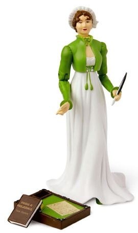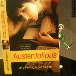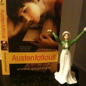In other news, Kensington sent me some marketing cover flats for AUSTENTATIOUS! They are very striking–I like the mustard yellow spine–and my name on the cover! My Jane Austen action figure had a little fun posing with the cover flats…