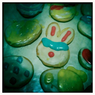 A couple of ninja bunnies infiltrated a countertop of frosted Easter eggs.They're not quite so fastidious or quick-witted as your typical ninja...they're obviously still in training. They should stay on high alert, because there are two boys close by who are likely to attack...with teeth!The End.