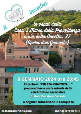 Lunedì prossimo 5 febbraio vi aspettiamo al Battistero di san Giovanni in Laterano per proseguire il nostro annuale cammino del Monastero WiFi di Roma di approfondimento della Liturgia della Parola. Ce ne parlerà don Nico Rutigliano. Come sempre Padre Pierluca Bancale, legionario di Cristo, sarà a disposizione per le confessioni. Alle 20.30 momento conviviale con spuntino nei locali adiacenti al Battistero (dove ci lasciano parcheggiare) poi alle 21 in chiesa catechesi, adorazione e compieta finale.