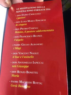 Grazie a don Dario Criscuoli (i pastori), don Luigi Maria Epicoco (la zingara), don Pietro Cesena (il pastore addormentato), don Francesco Buono (l’angelo), padre Giulio Albanese (i Magi), don Vincent Nagle (il bue e l’asinello), don Antonello Iapicca (san Giuseppe), don Renzo Bonetti (Maria), padre Maurizio Botta (Gesù Bambino), e grazie ad Alvaro Mascioni, l’editore della SHALOM preziosissima casa editrice, che lavora instancabilmente e generosamente per il regno dei cieli.
