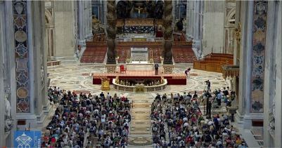 Il brano che abbiamo letto prima del Santo Padre Francesco continua così: “Il gesto di Gesù compiuto nell’ultima Cena è l’estremo ringraziamento al Padre per il suo amore, per la sua misericordia. Ringraziamento in greco si dice eucaristia. E per questo il sacramento si chiama Eucarestia: è il supremo ringraziamento al Padre, che ci ha amato tanto da darci il suo Figlio per amore. Ecco perché il termine Eucarestia riassume tutto quel gesto, che è gesto di Dio e dell’uomo insieme, gesto di Gesù Cristo, vero Dio e vero uomo. Dunque la celebrazione eucaristica è ben più di un semplice banchetto: è proprio il memoriale della Pasqua di Gesù, il mistero centrale della salvezza. Memoriale non significa solo un ricordo, un semplice ricordo, ma vuol dire che ogni volta che celebriamo questo sacramento partecipiamo al mistero della passione, morte e resurrezione di Cristo. L’Eucarestia costituisce il vertice dell’azione di salvezza di Dio: il Signore Gesù, facendosi pane spezzato per noi, riversa infatti su di noi tutta la sua misericordia e il suo amore, così da rinnovare il nostro cuore, la nostra esistenza e il nostro modo di relazionarci con lui e con i fratelli. È per questo che comunemente, quando ci si accosta a questo sacramento, si dice di ricevere la Comunione, di fare la Comunione: questo significa che nella potenza dello Spirito Santo, la partecipazione alla mensa eucaristica ci conforma in modo unico e profondo a Cristo, facendoci pregustare già da ora la piena comunione con il Padre che caratterizzerà il banchetto celeste, dove con tutti i santi avremo la gioia di contemplare Dio faccia a faccia.”