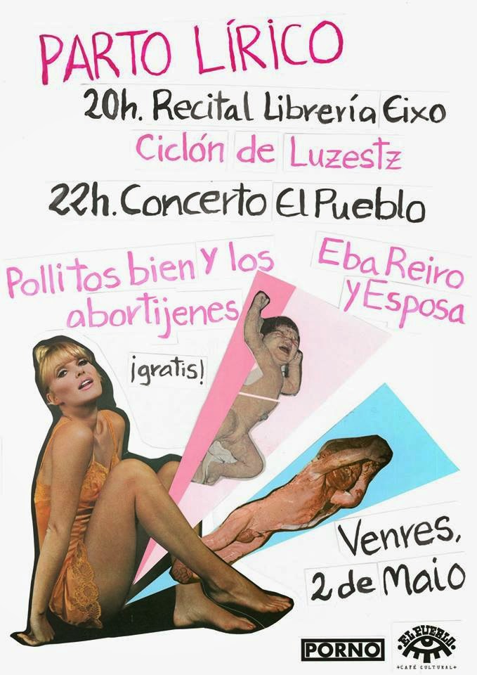 Ma��ana estar�� por aqu�� recitando/cantando/berreando junto a la m��sica de Esposa (Cibr��n y Xacobe) y otra muchachada muy prometedora. Ser�� en El Pueblo Caf�� Cultural (Ourense), evento promocionado por Discos Porno.