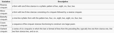 There are five lines in a cinquain--that's a basic rule, and I'm not sure what to call the kind of cinquain I do. Maybe it's the basic form or perhaps it's just the English version or the one they teach in schools.