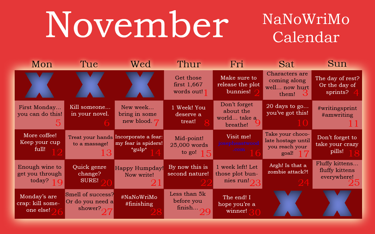 Plan spontaneity: yes, ha ha, you can't really plan to be spontaneous. You can, however, plan days where you will kill a character, or introduce a character. If you see the calendars that I've created below, you'll see on some of the days I've add "kill someone"... I'm sure it will be fun to be a bit spontaneous!