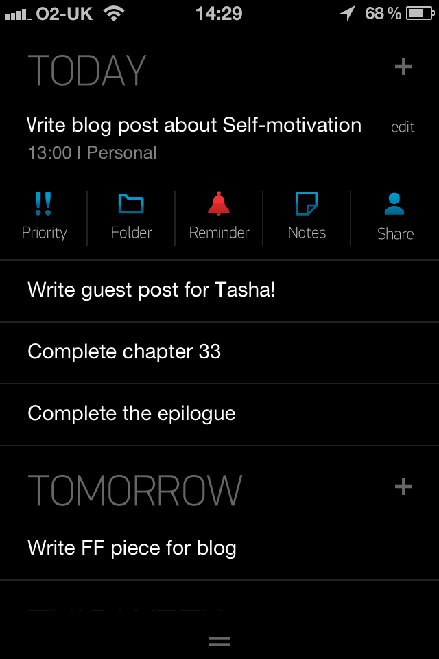 As I cannot contain my excitement over this app, I'm going to say a little bit more about it. Well, this app is just amazing. You can see beneath the point there are 5 sections: "priority", "folder", "reminder", "notes", and "share". If you click "priority" the point goes from white to red, and as you can see, I set a reminder to write the post. I also had the option to write notes, which, would help me when it came to writing the post (increasing the focus). And the share feature links up with Facebook to show people how much progress you've done. Hehe.
