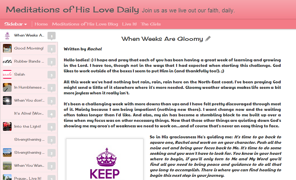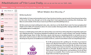 I am learning to rely on God, even when I don't feel he is close by. I am leaning the valuable lesson (yet again) that I cannot do things in my own strength I am also realizing that my books are not just stories, but projects that need a lot of prayer as they have the power to change lives.