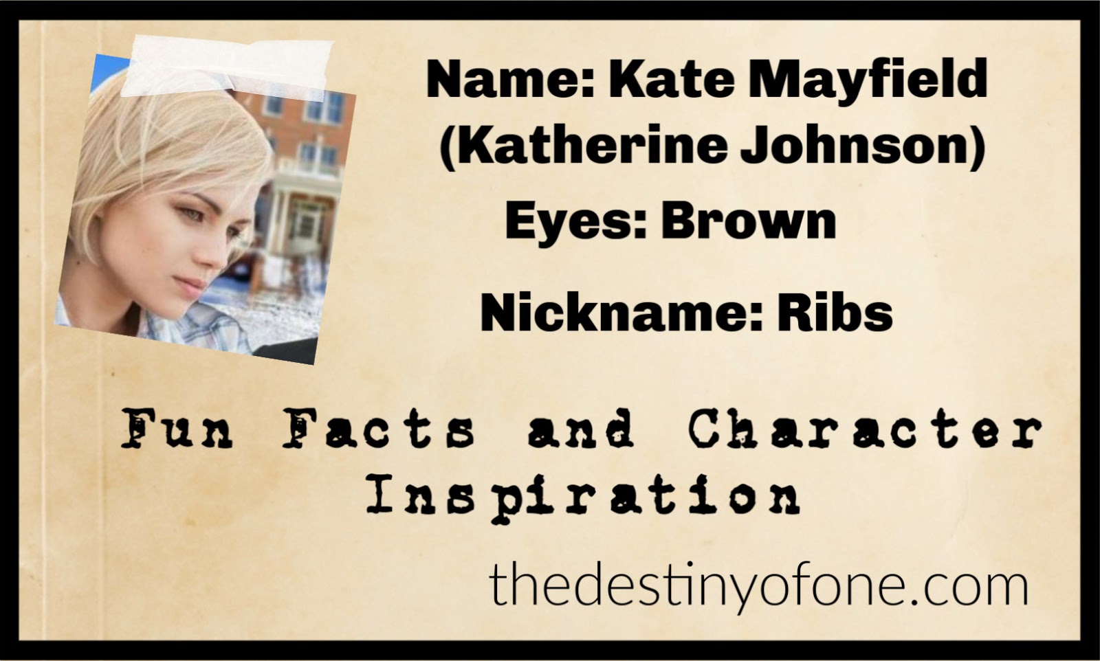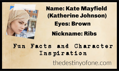 Kate's Relation to the Author: If you met me, you would probably think that Kate and I have very little in common. However, Kate's reaction to many things are my gut reactions, though not necessarily the ones I allow to control me. Also, after I started writing her, I became a lot more klutzy. I blame Kate for this entirely.