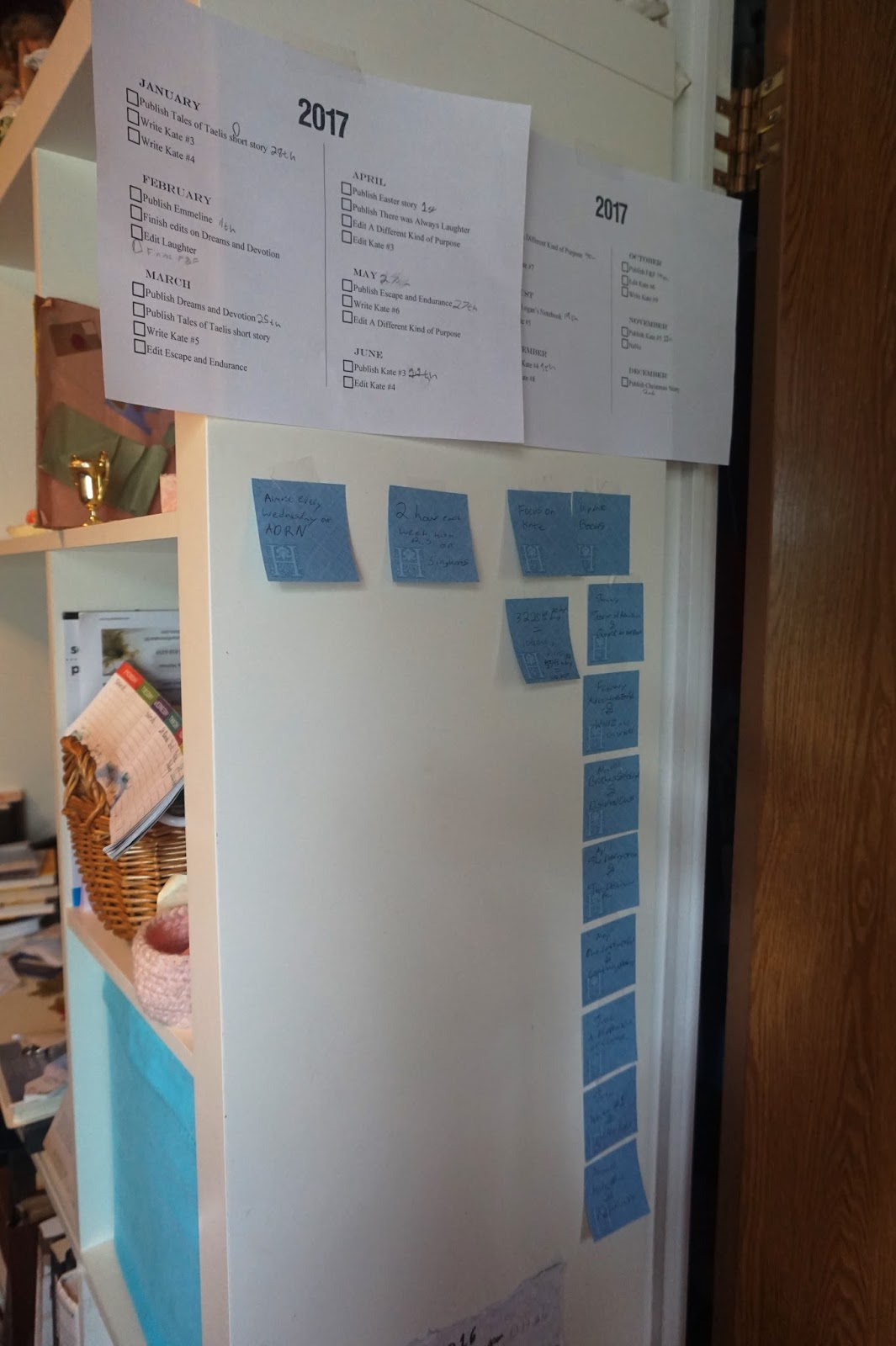 Today was one of my favorite days of the year: Planning day. It is when I sit down and make my plans for the next writing year. Normally, I do this in December, but this year, I had to figure out some of the things that I need to wrap up this year to be ready for next year. To start with, I made up some basic goals (the white paper) and then I broke it down (blue squares).