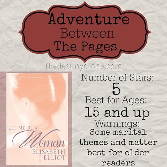 The advice was so steeped in Scripture without any of the softening that so many books try to do. I loved the way she made fun of feminism and did not shy away from saying things that are politically incorrect with no apology. So many books on womanhood for Christian women (I am finding) almost sound as if they are apologizing for the politically incorrect way God wants women to live. Elisabeth Elliot does not apologize; she shows what a wonderful thing is.