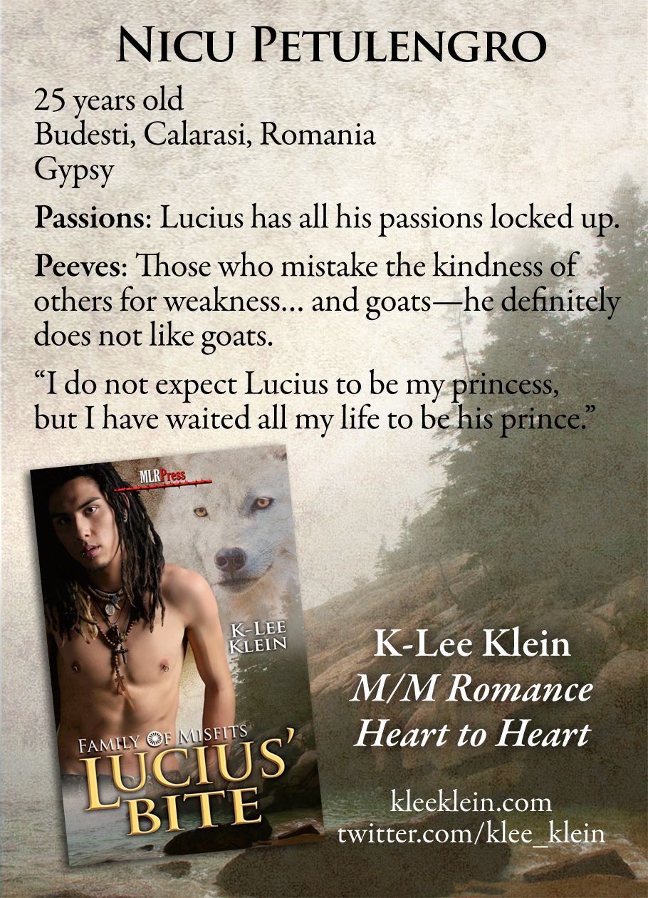 I've been dying to share my character cards with everyone that didn't go to GRL and since it's over, here they are. :) My fabulous friend, writer and graphic designer - L.C. Chase - made them for me - she's also the one who did the cover for Lucius' Bite and will do the rest of the series too. And if you ask her what kind of client I am I'm sure she'll say a very picky, anal retentive, perfectionist one. ;) And I totally am.