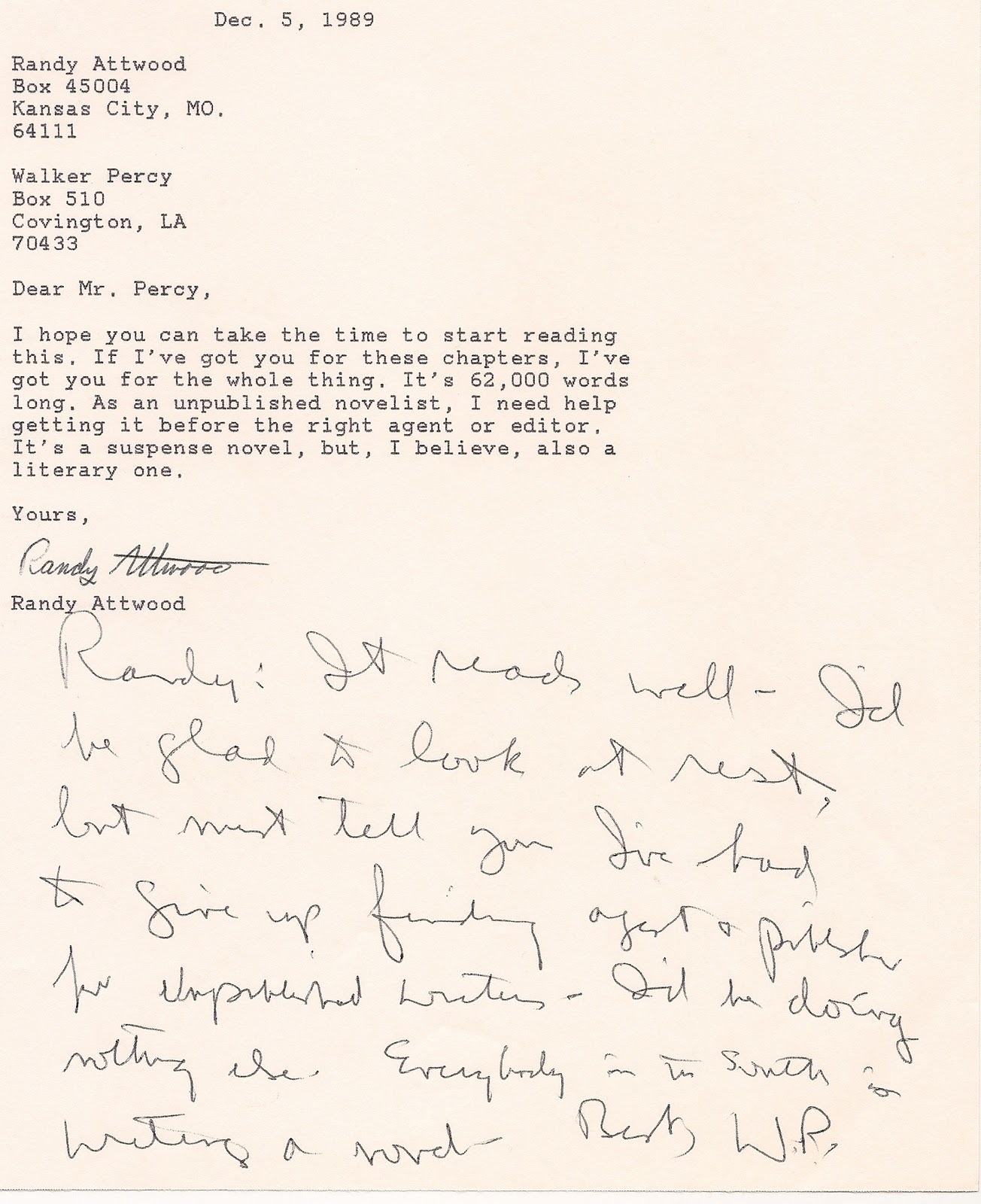 In Dec. of 1989 I sent the first three chapters of a novel I had written to Walker Percy. Shortly after, I received his handwritten response on my cover letter: "Randy: It reads well — I'd be glad to look at rest, but must tell you I've had to give up finding agent or publisher for unpublished writers — I'd be doing nothing else. Everybody in South is writing a novel – Best, W.P." I sent the MS to him and waited and waited and then in May the following year woke up one morning to read his obituary in the paper.