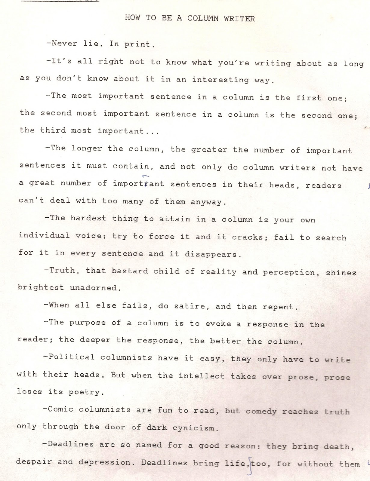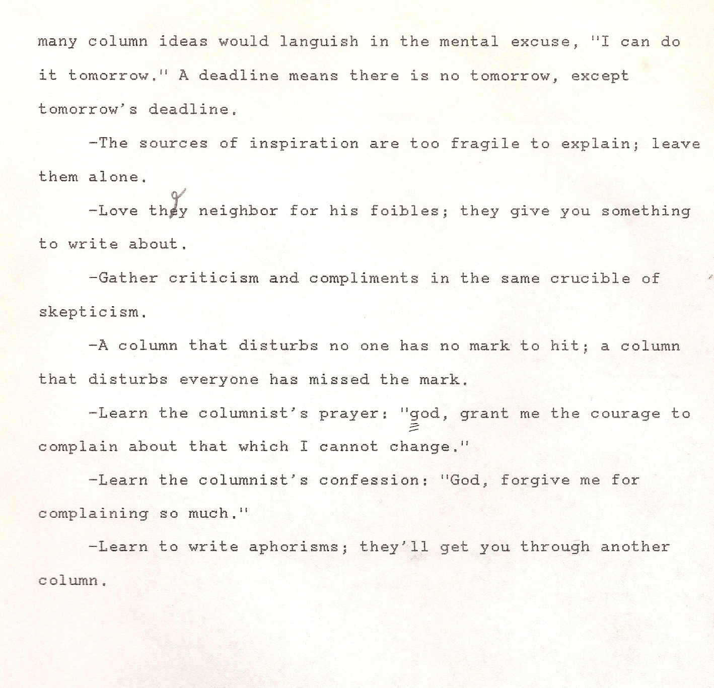 In 16 years working for two newspapers I wrote a lot of columns. I had thought to publish selected ones in a book, but never did so. But I did assemble and retype the ones I wanted to use and had them edited. And they have languished all this time. Thought I'd see what scans of those sheets would look like online. What think ye?